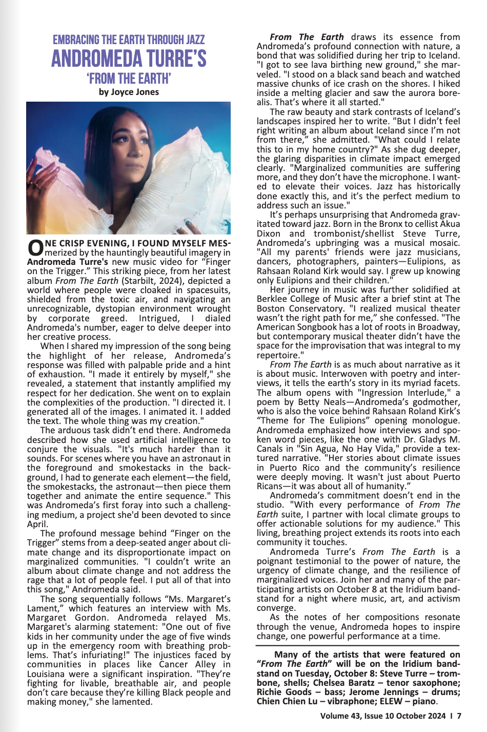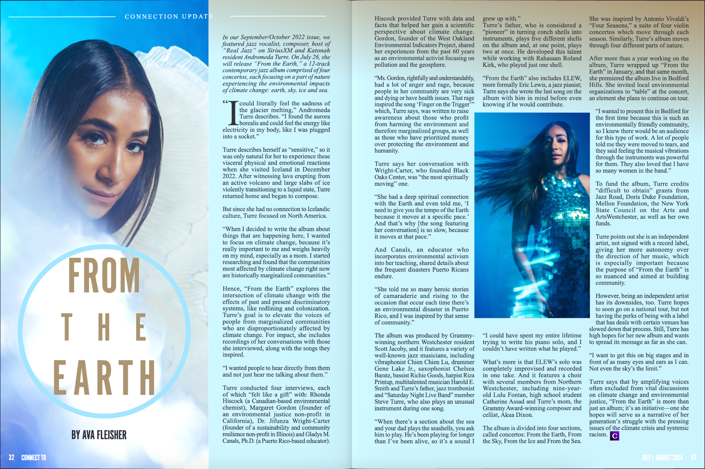 "From the Earth is a beautiful piece of music that invites listeners to engage with what is going on in the world… Turre’s vocals are exquisite; her phrasing is different, but I hear echoes of Abbey Lincoln.”